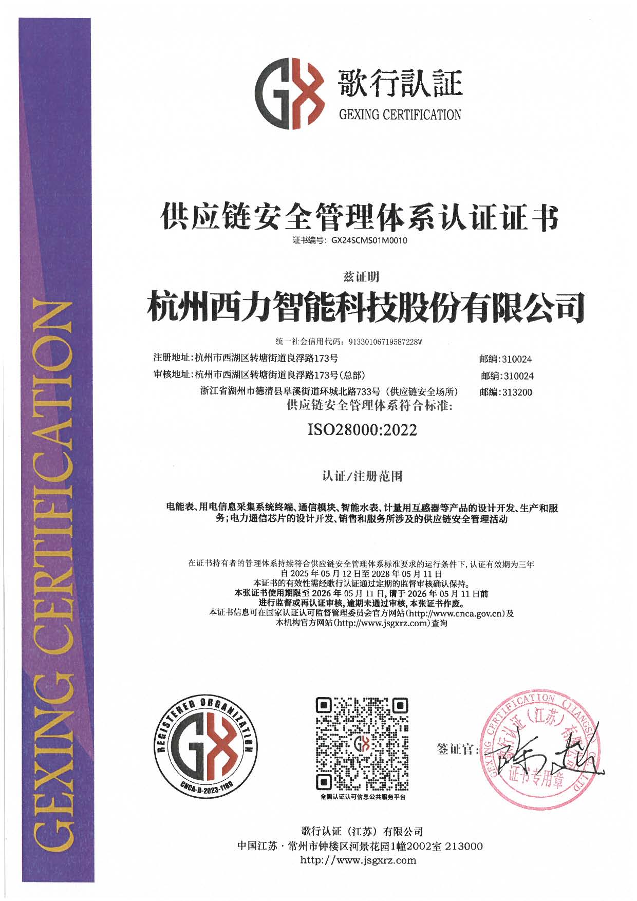 供应链安全管理体系认证证书